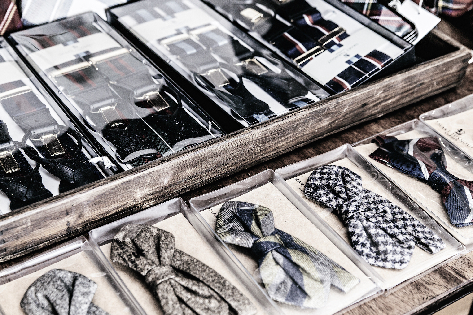 Die Accessoires des Londoner Labels tragen die Farben und Streifen britischer Regimenter und sind – indeed – very british. Das modische Zubehör aus Schottland kommt von Johnstons of Elgin und Lochcarron of Scottland, dem Profi für die markanten Schottenmuster. Und in einem alten Koffer können Sie sogar Sonnenbrillen im Tortoise-Look aus dem Londoner East End entdecken. Sie stammen aus den 70’s!