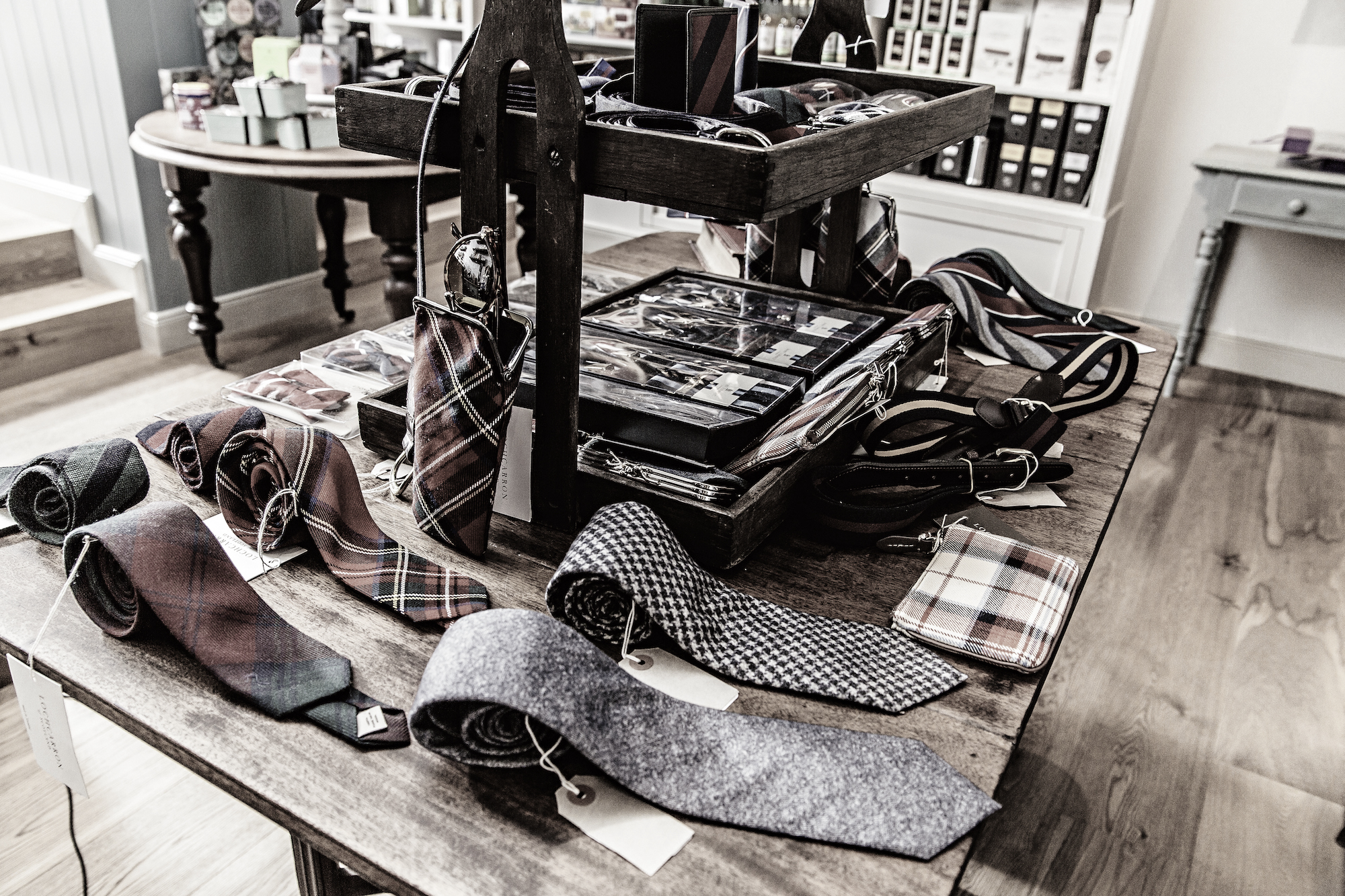 Die Accessoires des Londoner Labels tragen die Farben und Streifen britischer Regimenter und sind – indeed – very british. Das modische Zubehör aus Schottland kommt von Johnstons of Elgin und Lochcarron of Scottland, dem Profi für die markanten Schottenmuster. Und in einem alten Koffer können Sie sogar Sonnenbrillen im Tortoise-Look aus dem Londoner East End entdecken. Sie stammen aus den 70’s!